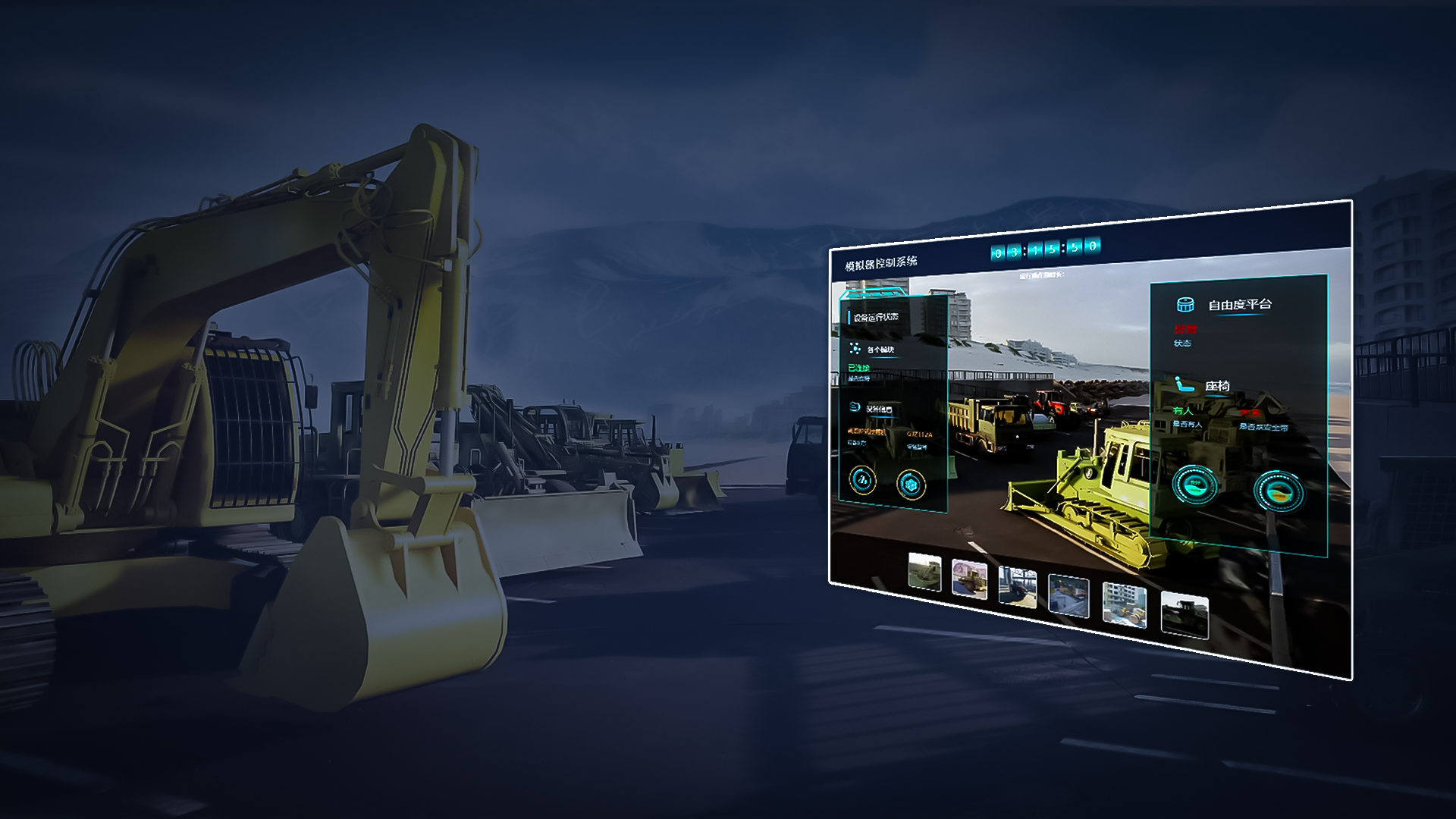 展的痛點,碩博提供工程機械仿真整套解決方案,操作場景、訓練科?、顯?效果